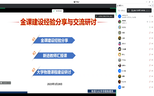 2023年3月28日晚上7点,为落实学校以及学院“两性一度”金课建设,bevictor伟德官网物理系开展了以“金课建设经验分享与交流研讨”为主题的线上会议,会议由物理系主任吴昌义主持,物理系全体教师参加了会议。会议内容包括三大部分内容:第一,金课建设经验分享;第二,新进教师汇报课;第三,大学物理课程建设研讨。
