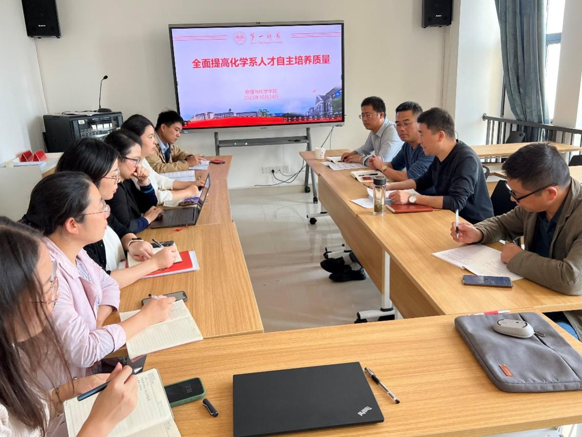为全面贯彻落实学校本科教育教学大会精神,10月24日下午,我院化学系召开全面提高人才自主培养质量研讨会。会议由教学副院长邹立军主持会议,陈志武书记、副院长马元鸿以及化学系全体教师参加会议。